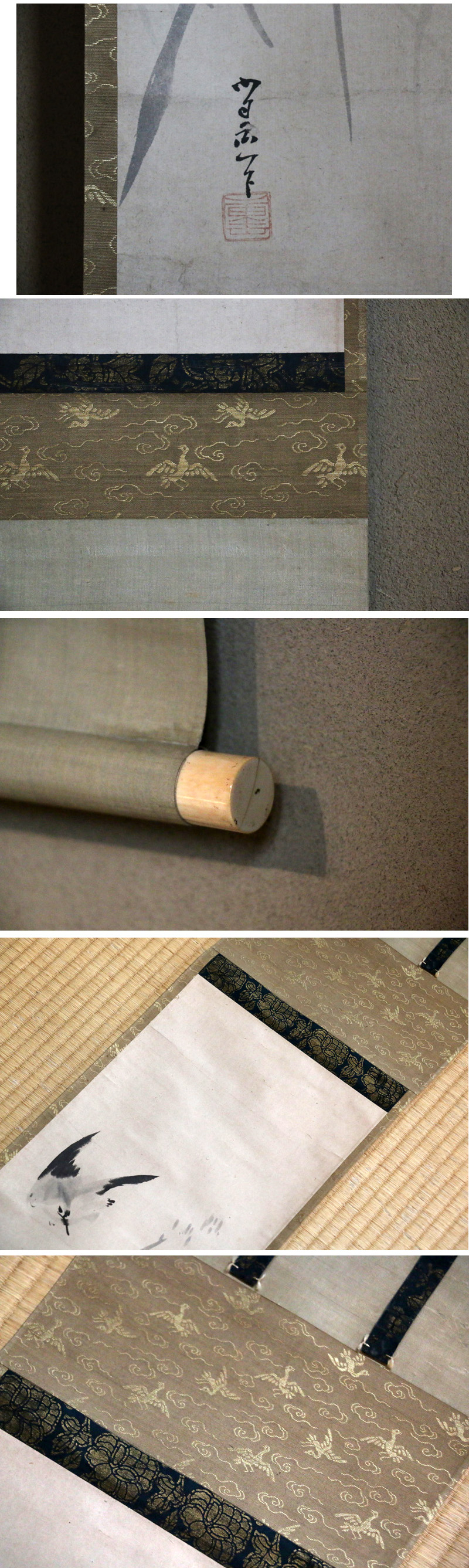 二重箱外箱の蓋に久隅守景|葦に翡翠と記した三井家「三井高生」旧蔵貼紙、内箱はややサイズが合いませんが「書画作品にはしばしば見受けられます」後世に内箱のみ取り替えた、もしくは内箱のみだった箱を三井高生自身が長さがピッタリの既存の外箱に収めた物でしょう。