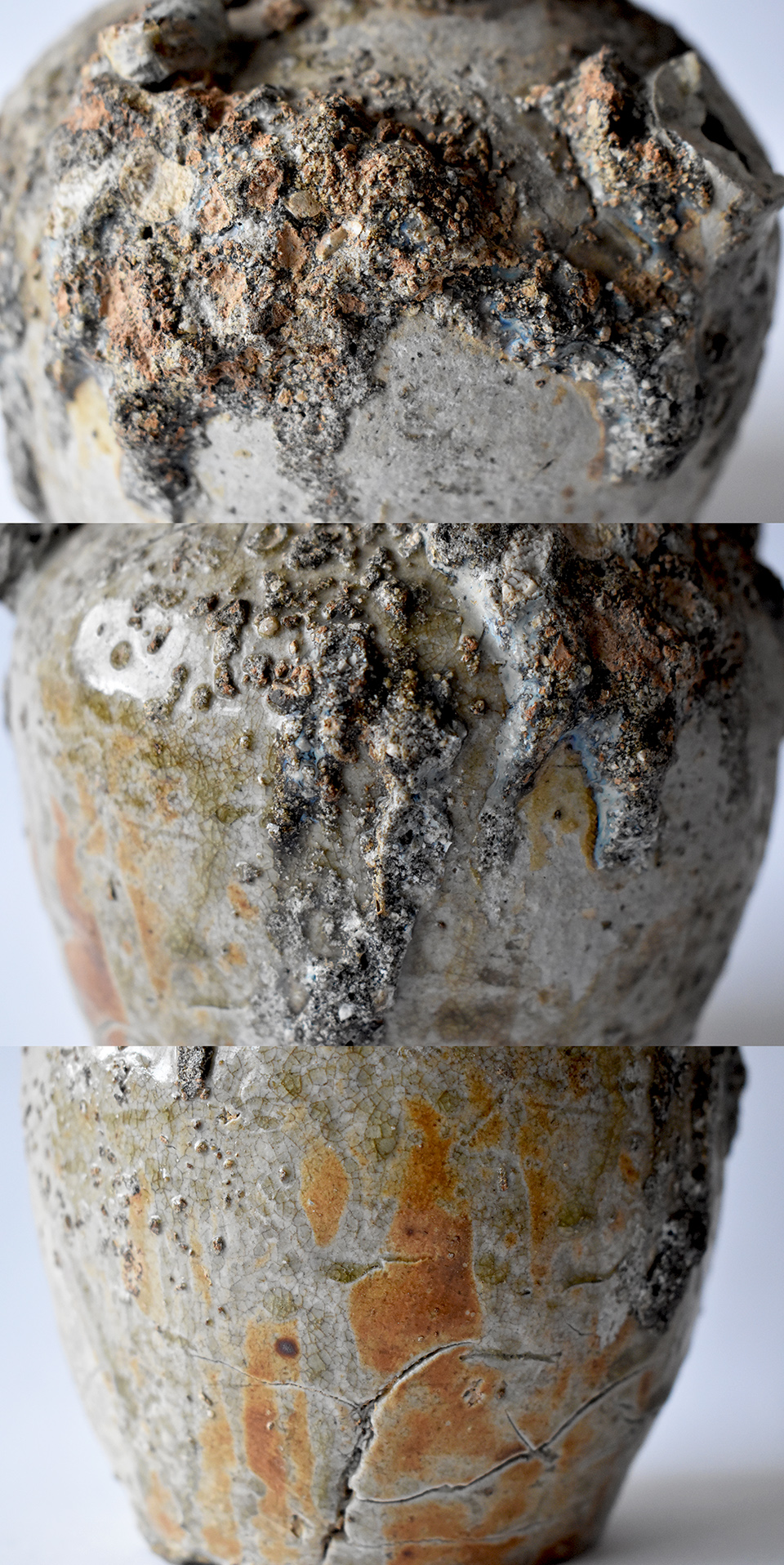 窯の中の壁の一部が剥がれ落ちて付着したのでしょう。口縁や肩にどーんとたくさんの降りものが付着しています。ベースの灰釉の上に石状の壁面がありそれが「卯の斑」を纏って青白く光っているのが魅力ですね。