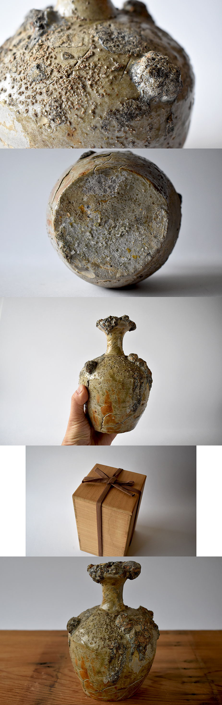 またこの時代は灰釉もあまり安定したものじゃなく、器体の上でムラムラと不均等な上がり方をしていて流下する灰釉の間はオレンジ色の火間が、これまた見事な景色になっています。