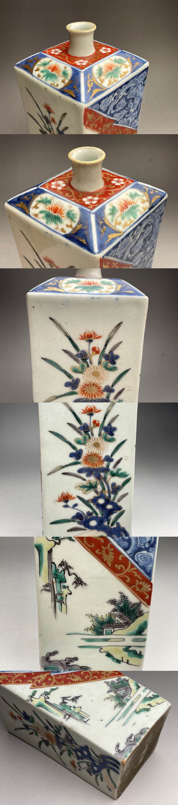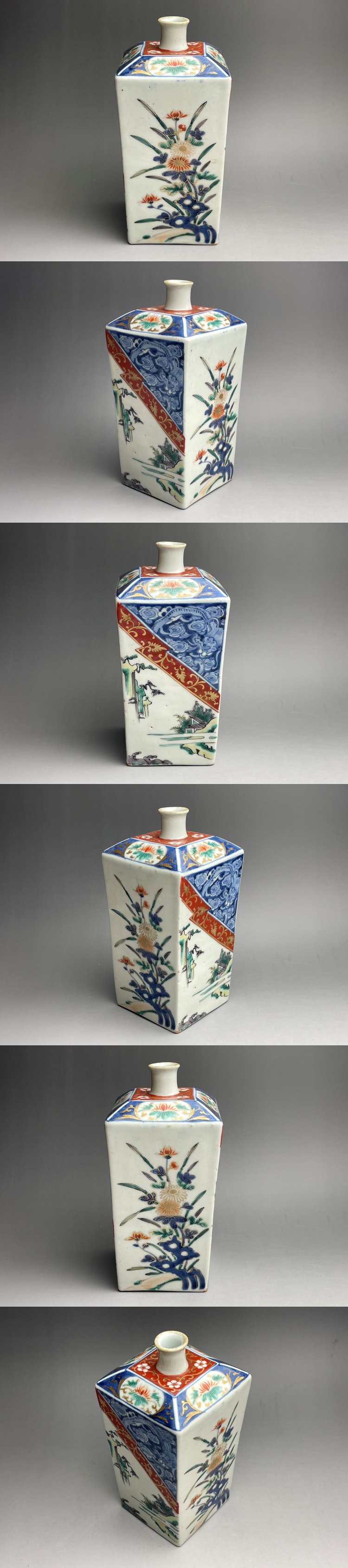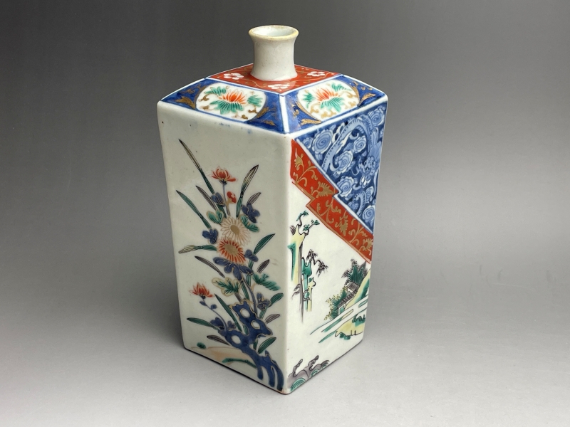 龍、山水、菊花などを描いた伊万里色絵の角瓶です。