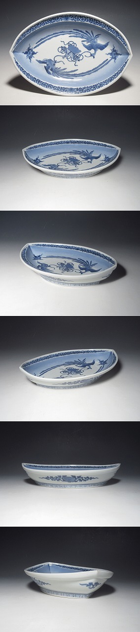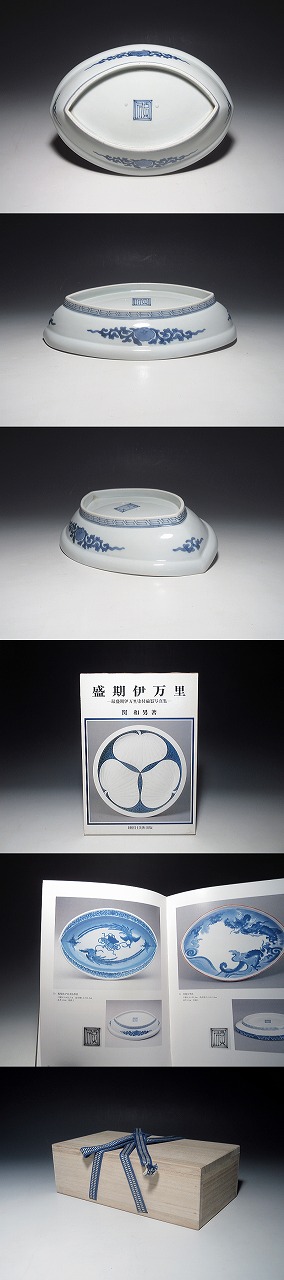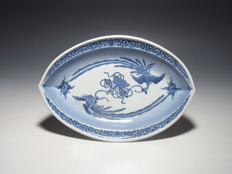 正確な成形力で木瓜形に造形され、絵付は、ご覧の通りの完璧な出来栄えです。縁には、二重線の蛸唐草文、薄瑠璃釉を用いた淡い画面に細密な宝尽くし文と向い鳳凰文が