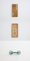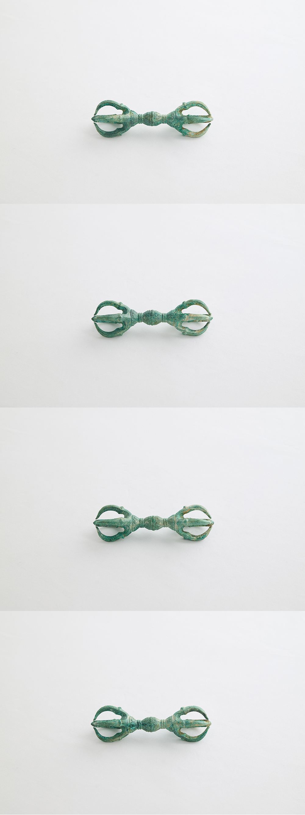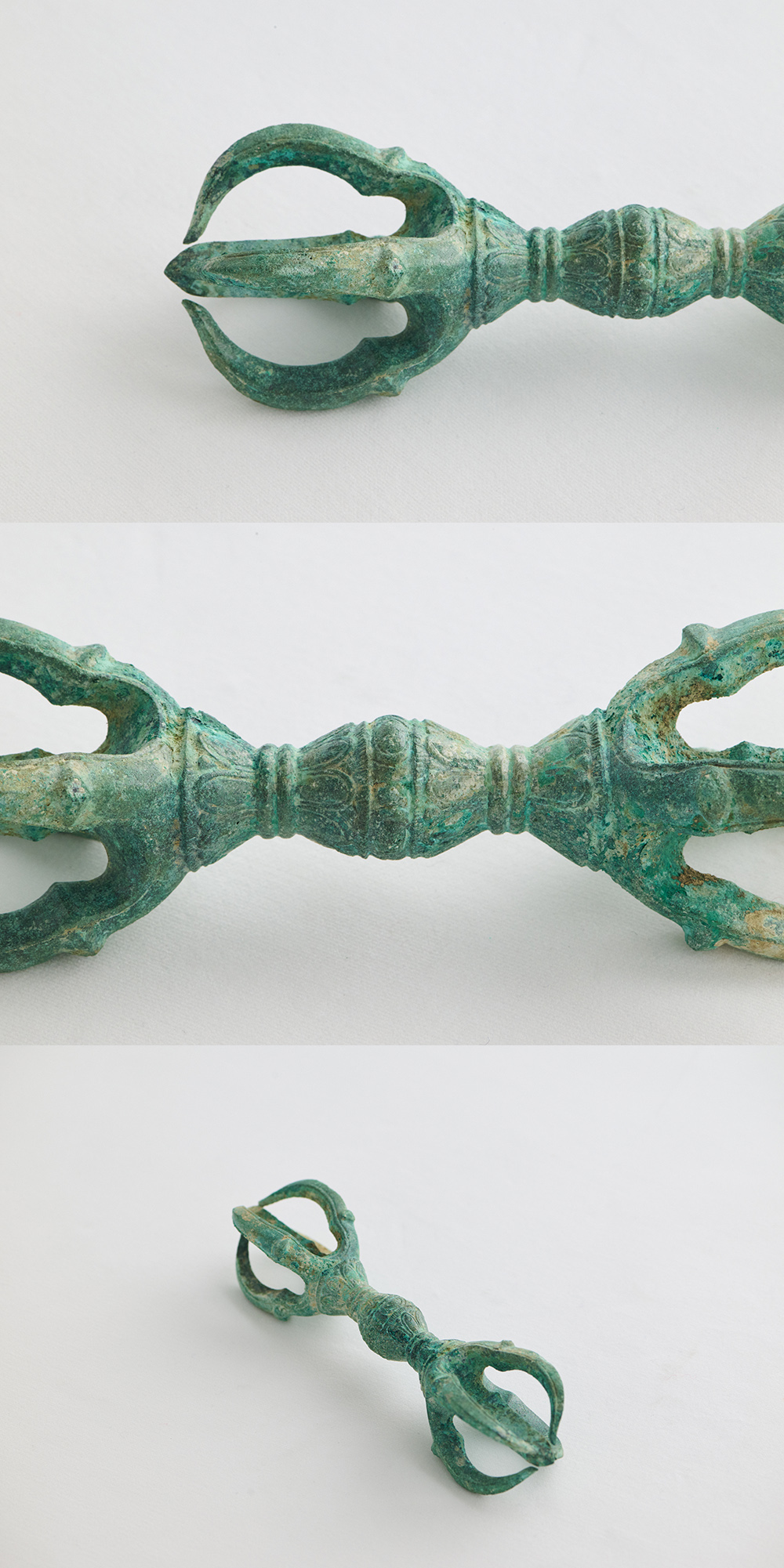 全体に緑青が吹いた、経塚発掘と思われる五鈷杵です。しっかりと放出感のある脇鈷のカーヴや雄渾な鬼目をもつ柄部など平安時代後期の古様を感じさせますが、脇鈷の先端が牛骨形で楕円形の鬼目、蓮弁も単弁になるなど鎌倉時代の特色が散見されることから藤末鎌初と判断しました。