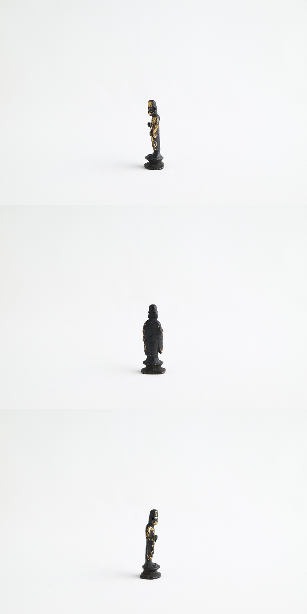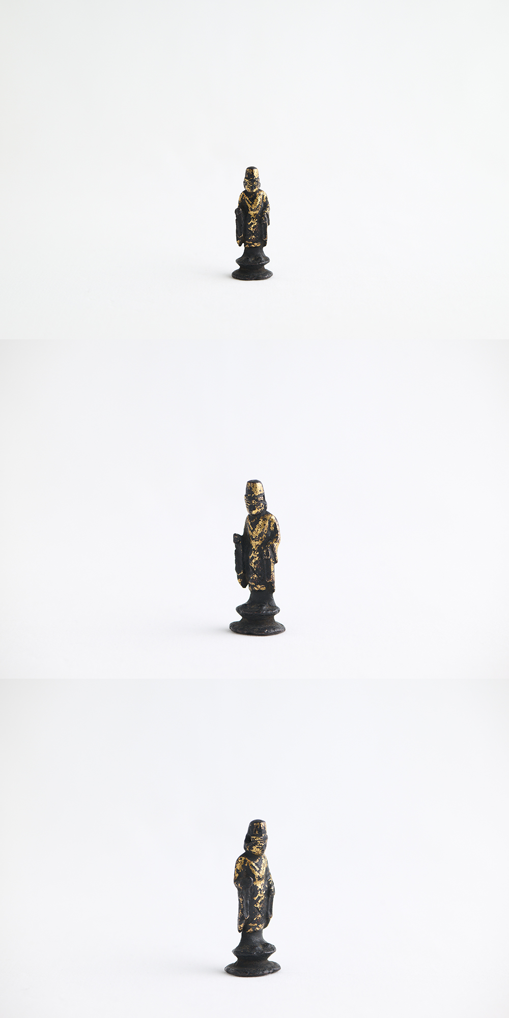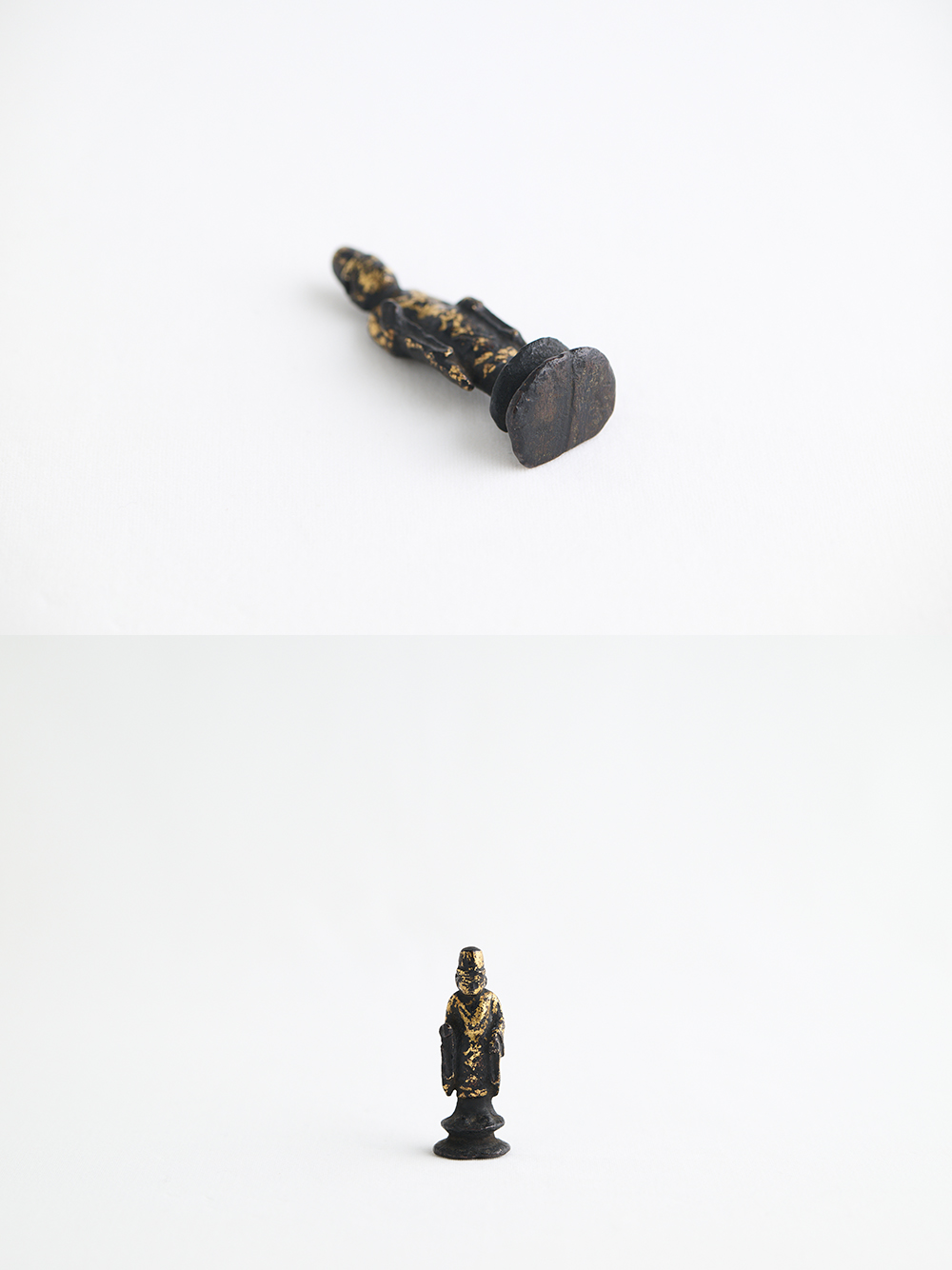 ふだんより旧い金銅仏に親しんでおられる方には肯首いただけると思いますが、平安時代の小金銅仏は関東地方を中心に土中発掘の遺品がおおく、そのほとんどは鍍金が剥がれ(火災により融けて)、表面が荒れた作品がほとんど(もとより鍍金を施さない像も多い)ですが、この金銅仏は奇跡的に伝世で鍍金がパーフェクトに残存しております。どれほど奇跡的かというと私の経験上、1/300くらいの感覚です。それほど鍍金がふんだんに遺る平安の小金銅仏はレアだと思います。つまり本作品は土中に埋葬された経塚奉納用ではなく、おそらく貴族の念持仏か胎内仏であった可能性が高いでしょう。
