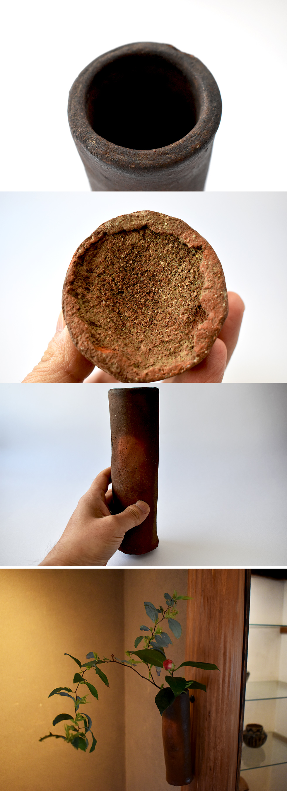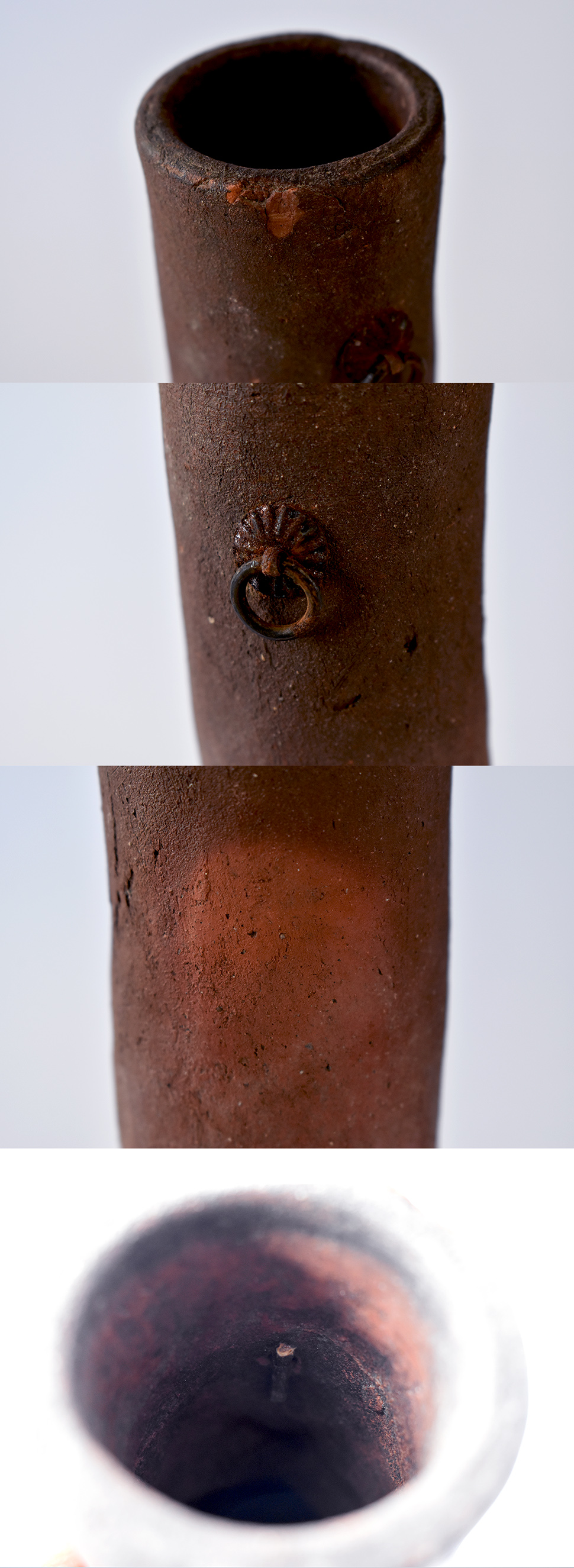 仏花器として作られたものに現代のどなたかが金具を取り付けて掛花入としていますね。床柱に掛けても壁面にもいい感じで収まってくれます。