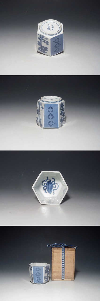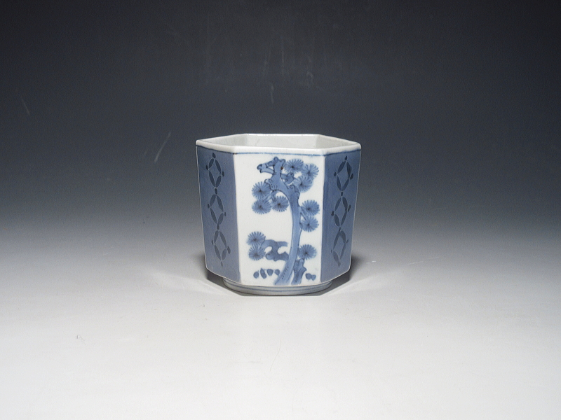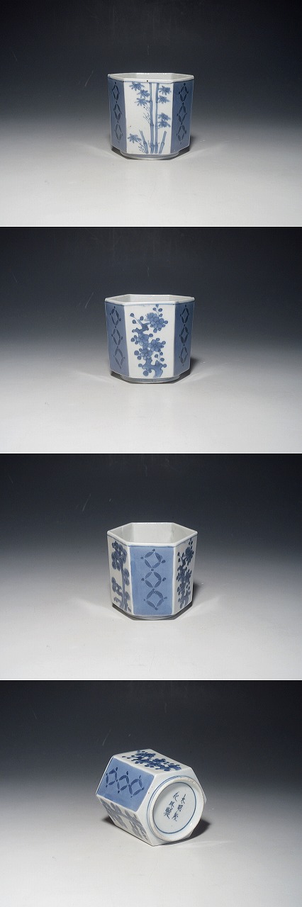 藍九谷の珍品をご紹介させて頂きます。六角面取りの長猪口です。サイズ感としては、大ぶりののぞき猪口程度です。これまで、数多くの藍九谷作品を扱って参りましたが、長猪口は、初めてのご紹介となります。六面に、松竹梅文と瑠璃地の七宝文が交互に絵付されています。また、見込みもしっかりと描いています。上品な印象を醸し出した名品です。