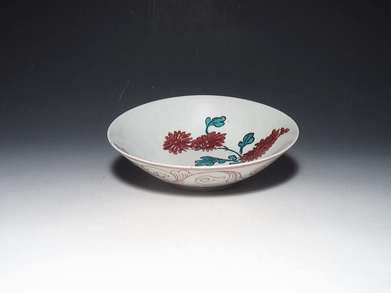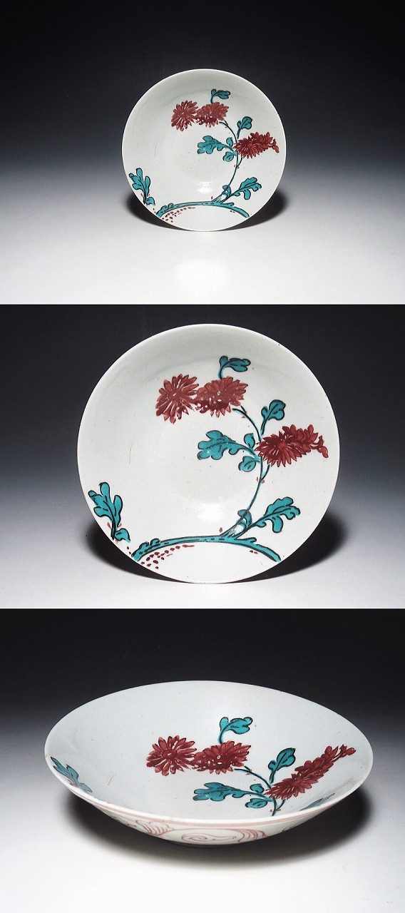 古格を感じる色絵古九谷です。ラフな筆致で、のびのびと菊花が描かれています。赤絵と緑色が見事に発色しています。余白取りも絶妙です。特筆すべきは、裏絵です。赤色の細線で、勢いのある唐草文が描写されています。あまり見かけない、見事な裏絵です。表絵のラフさと裏絵の細密さが、不思議な相乗効果を得ています。400年近い、