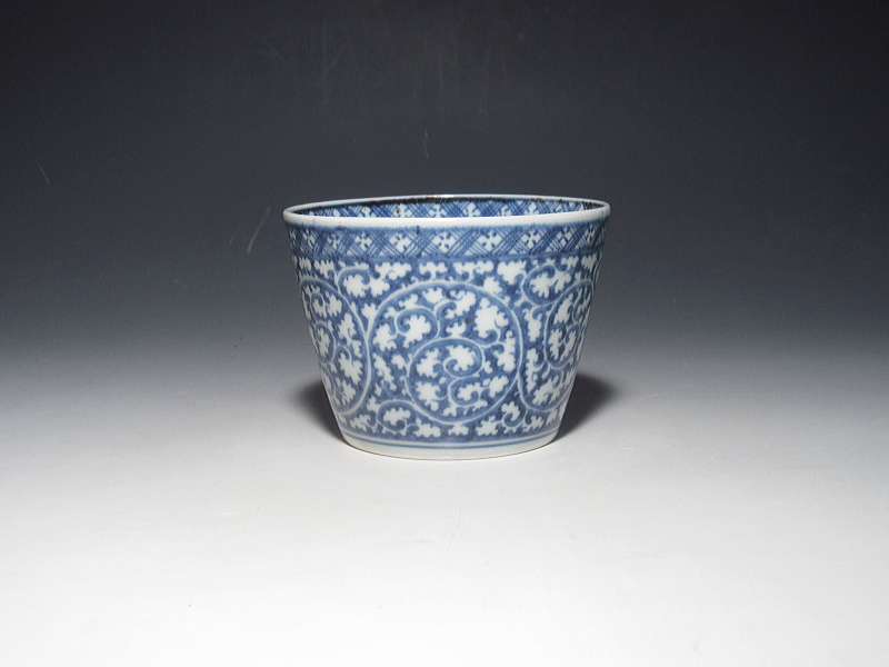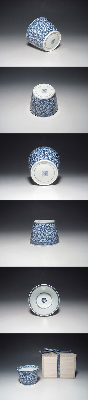 薄手、大ぶり、べた底、渦福銘、すべての条件を満たしたそば猪口です。古伊万里収集家の中でも、そば猪口をお集めの方は多く、上手のそば猪口は、お皿等と比較しても、かなりの高額品となってしまいます。普段は、あまり扱わないのですが、これはと思える逸品に出会えました。魅力の条件をすべて満たし、上がり、発色も秀逸です。そば猪口コレクター様にはもちろん、蛸唐草コレクター様にも、必ずやご納得頂ける優品です。