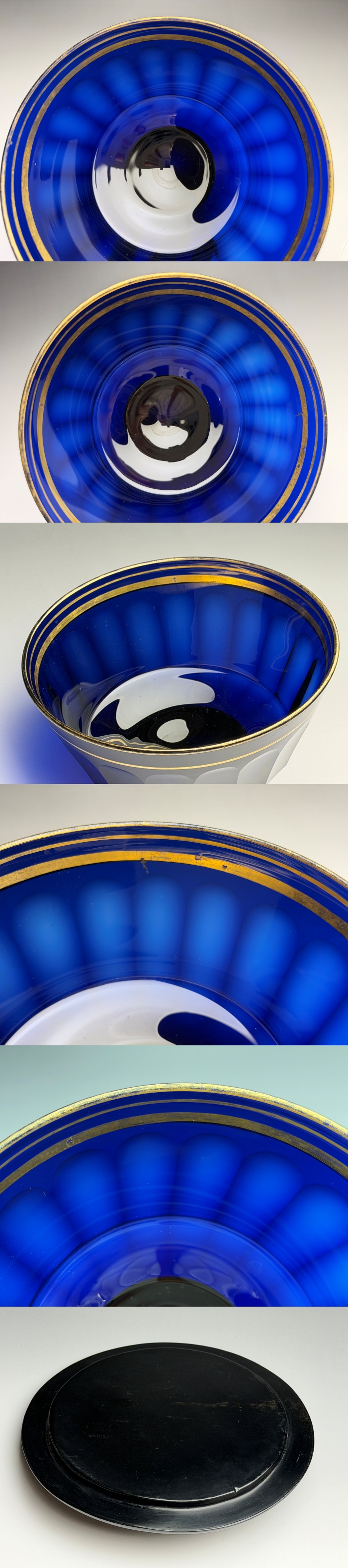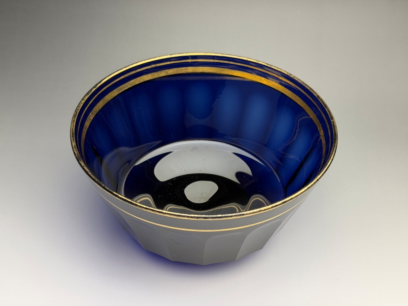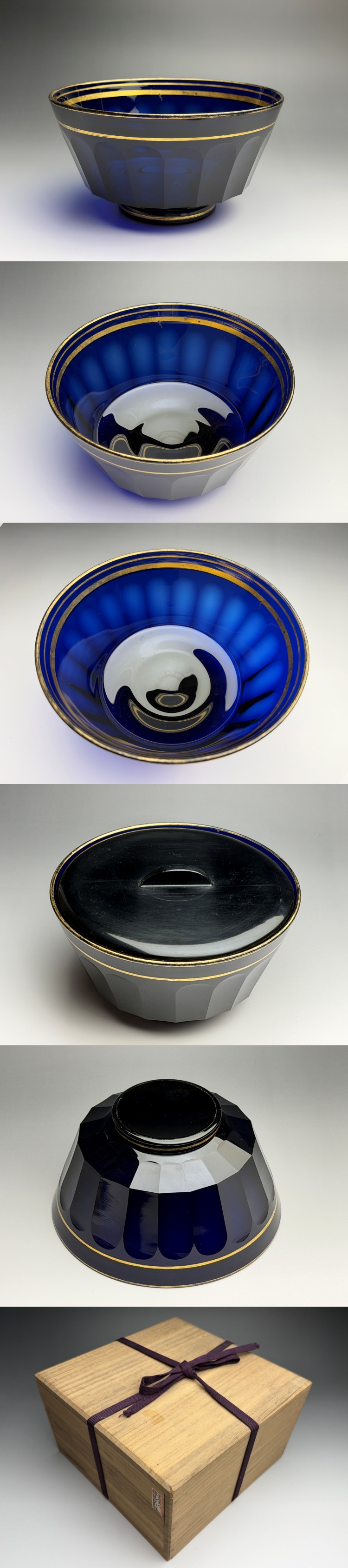 胴から高台にかけて花のように二段の面取りをした瑠璃金彩のガラス鉢です。塗蓋が付いていますので、水指として使われていたものでしょうか。キリッとした形の良い鉢で、暑い時期にはそうめん鉢としても涼しそうです。