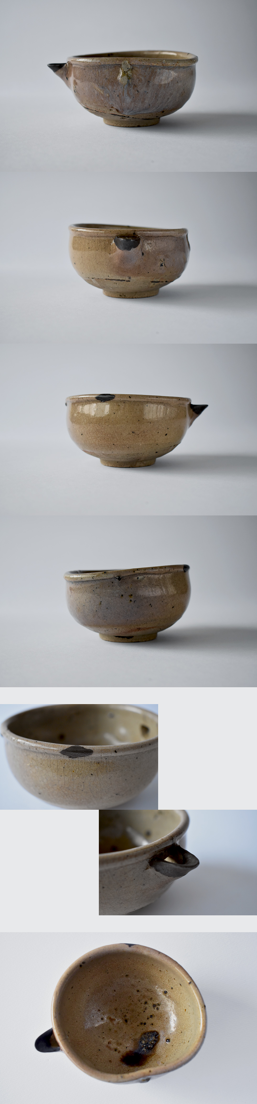口縁に削げ、注ぎ口の欠損、いずれも燻銀繕いになっています。歪んだ部分には隣の器物の接触痕が見られます。もちろんこれらはご使用には支障なく、気持ちよくお使いいただけるかと思います。