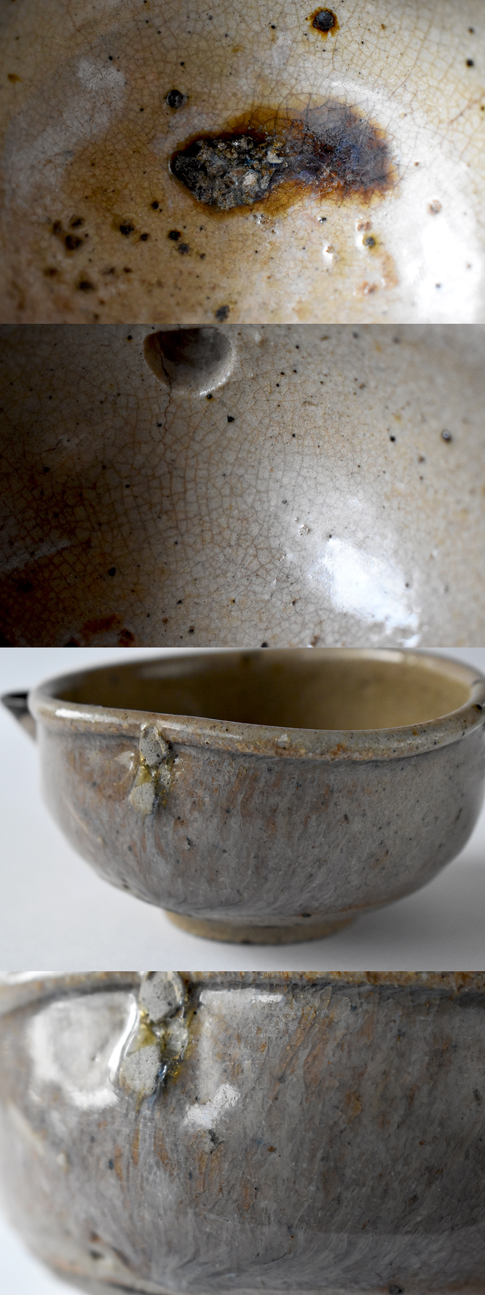 全体を灰釉が覆ったもので、ひっつき痕が残る側面には藁灰成分が流れて、この部分が斑唐津のような色味になっていますね。青い卯の斑がたまらなくいい膚合いです。また見込みには鉄分の降りもの、これもマイナス感じる方がいらっしゃるかもしれませんが、私としてはこれがあったから使いたい!と思えたもの、見込みの景色として大いに賞玩すべきポイントかと思います。